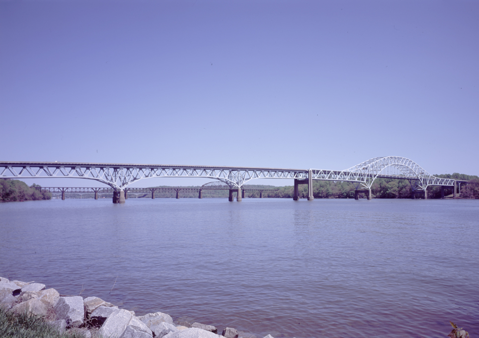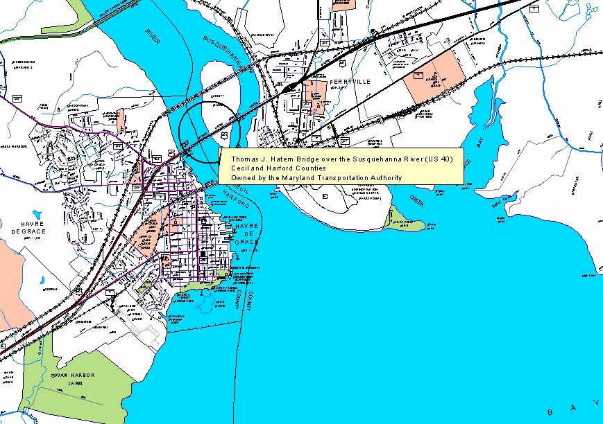 The point where the Susquehanna River meets the Chesapeake Bay has been a strategic crossing point for generations. Ferries made the long trip across until 1910, when local citizens converted a railway bridge into a toll bridge. It proved to be a gold mine but inadequate for the traffic, even with the addition of a second level. In 1940 the state erected this high, fixed steel truss to make the trip on US 40 safer and easier. Designed by the J. E. Greiner Company, the combination through-and-deck arch extends 7,618 feet and measures 177 feet from the water to its highest point. In 1986 it was dedicated to Hatem, a distinguished Harford County citizen.
